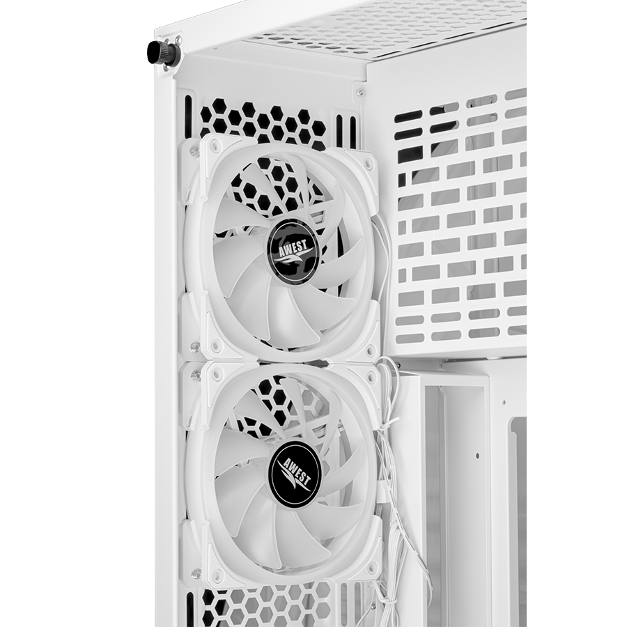 کیس گیمینگ اوست GT-AV402-FW جهت تهویه مناسب و خنک نگه داشتن محیط داخل کیس از 6 عدد فن 120 میلیمتری برخوردار است. این فنها از نوع سوپر سایلنت بوده و همراه با نورپردازی ARGB میباشد. در نمای جلویی کیس شاهد چهار فن به صورت خطی هستیم.