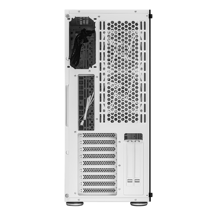 شاید اولین چیزی که از نگاه مخاطب کیس گیمینگ اوست GT-AV402-FW را از دیگر محصولات این خانواده متمایز میکند، محل و نوع قرارگیری منبع تغذیه است. در بین سایر کیسهای گیمینگ کمتر محصولی مشاهده میشود که پاور آن در بالا، آن هم از پشت سینی مادربرد و به صورت عمودی نصب شود. این ساختار باعث شده تا به یک فضای بینهایت برای نصب منبع تغذیه کامپیوتر درون کیس GT-AV402-FW دسترسی داشت. از طرفی میتوان از این بخش برای خروج هوای گرم ایجاد شده توسط پردازنده و کارت گرافیک استفاده کرد. چرا که با به کارگیری 2 عدد فن 120 میلیمتری در این قسمت میتوان به تهویه کارآمدتر دست یافت.